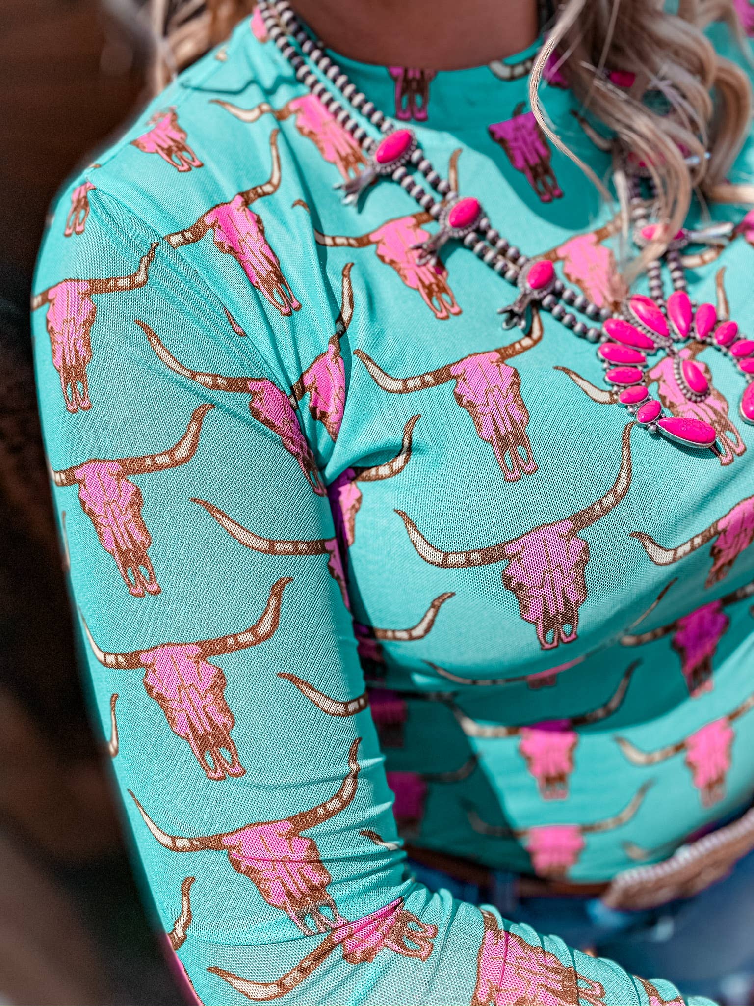 Pass this cute chick dressed to the nines and looking fine on her way to the concession stand! This design will have 'em all asking "Heifer, where'd you get that top?!" If turquoise and mint green had a cute cousin... that's the background shade of Cute Heifer that is accented with bubblegum pink cow skulls. Grab our own MK Pink Cadillac Corduroy Shacket and you've got yourself a 2 item sale!